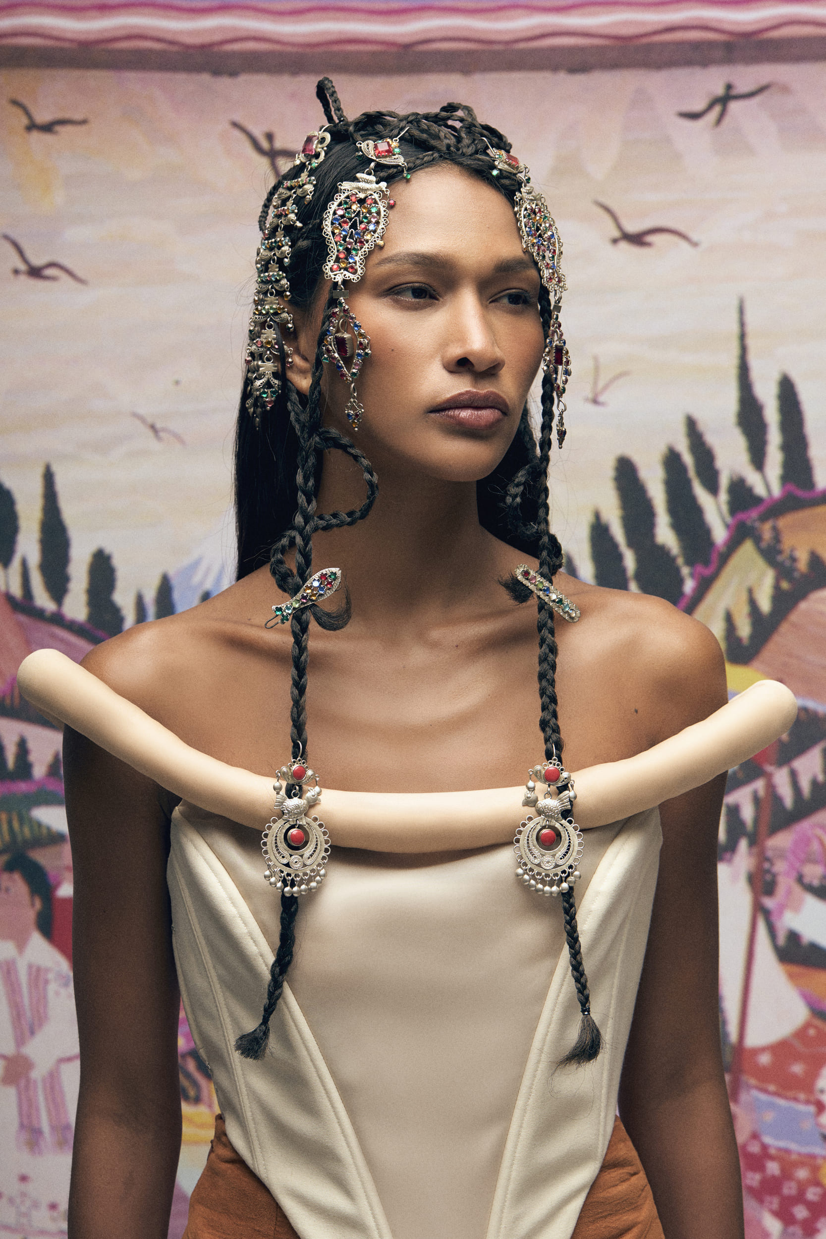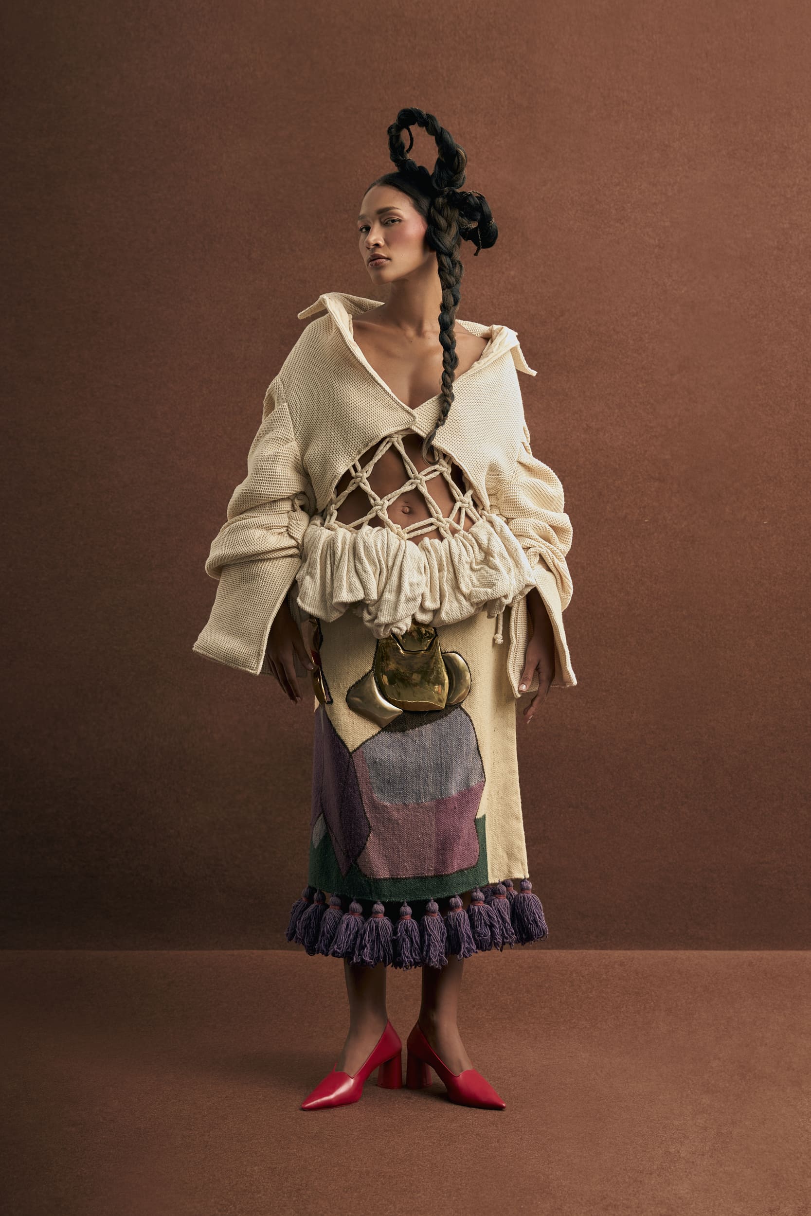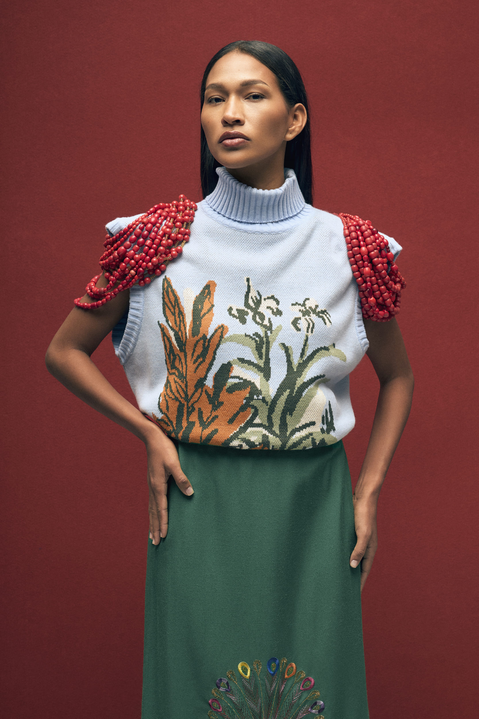 Andean Memory II begins with a gaze that looks at the language of dress without trying to pin it down. It draws from elements across Ecuador and Latin America—textiles, accessories, and ways of inhabiting the body—and places them elsewhere: not to represent, but to imagine. The garments featured in this series come from contemporary Ecuadorian designers, handcrafted pieces, and everyday objects that have been displaced from their original function. The editorial proposes a visual language that resists nostalgia and explanation, settling into a space between the familiar and the unfamiliar. It doesn’t aim to depict tradition or turn clothing into a symbol. Each composition becomes a speculative fiction—a choreography of materials and signs. From a mestiza and situated perspective, this editorial reflects on how fashion has fixed certain images and erased others. And it offers something else: a way of seeing that doesn’t aim to document reality, but to imagine what could be.